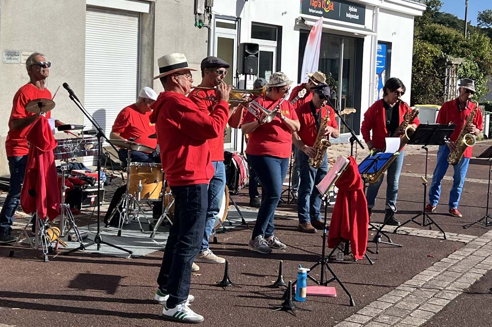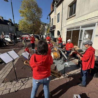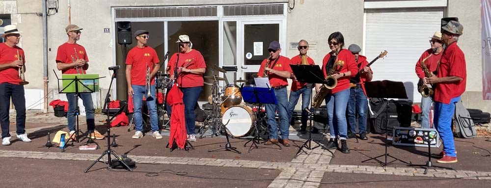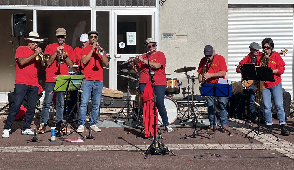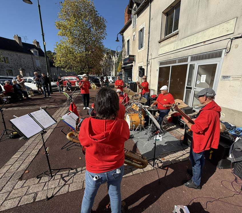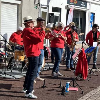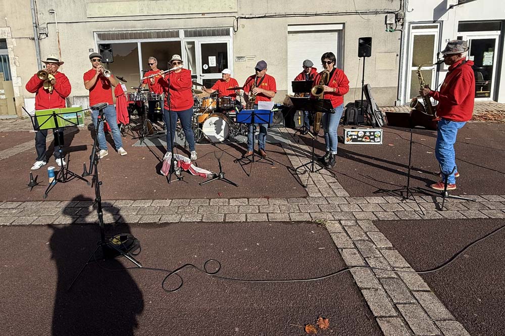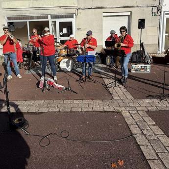 Soleil d'automne et accueil aux petits soins par les animateurs de la Fabric d'Orvault (Fabrique d’animations du BouRg et d’Initiatives Collectives) pour une prestation dominicale aux abords du marché, Place Jeanne d'Arc. Aux trompettes, Jacques, Étienne et Ludo, à la flûte traversière, Adeline, aux saxophones, Laurence, Jean-Michel et André, à la basse, Marc, à la guitare, Nicolas, et aux percussions, Raymond et Philippe.