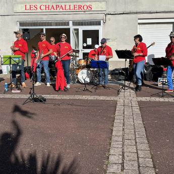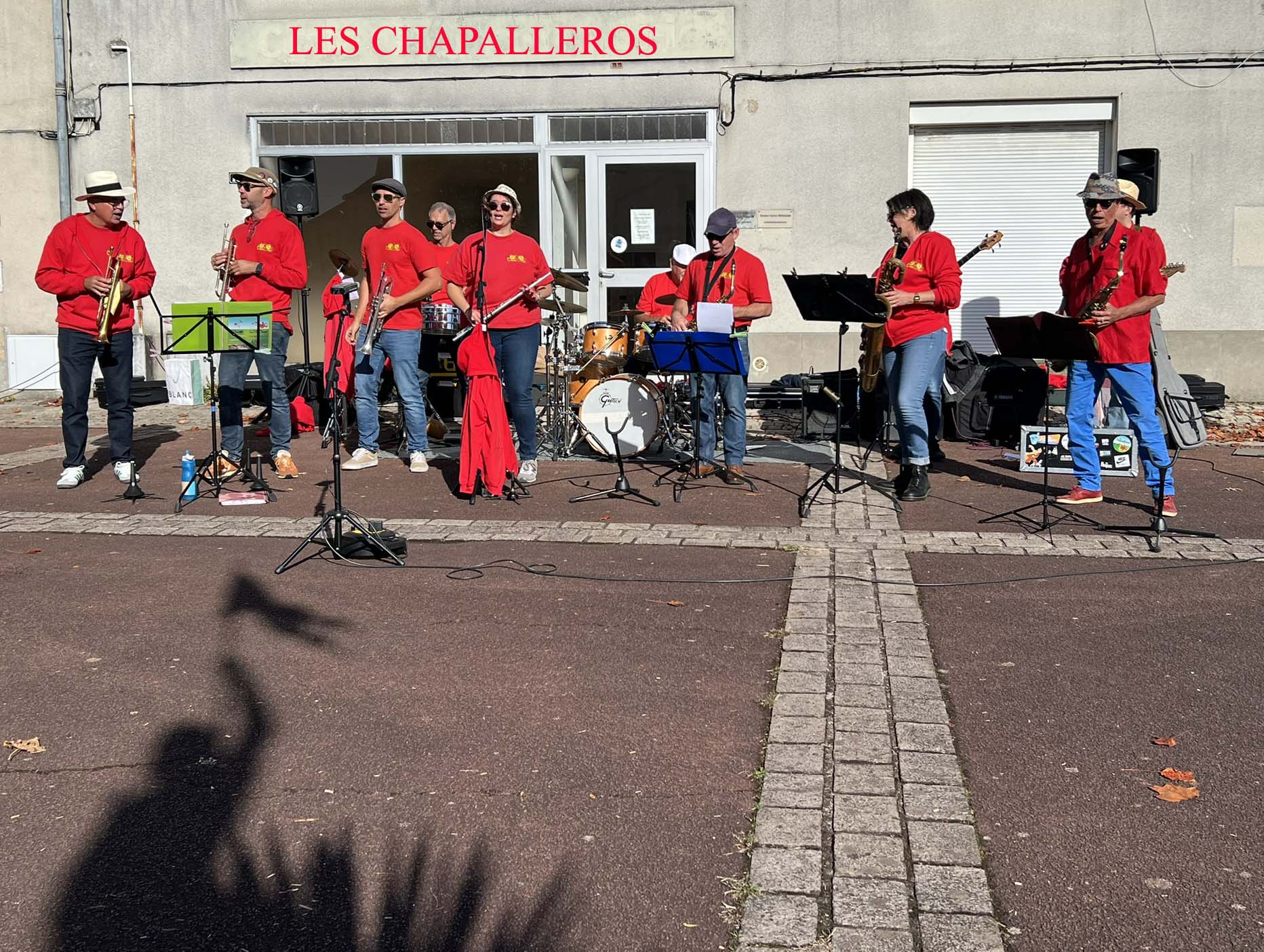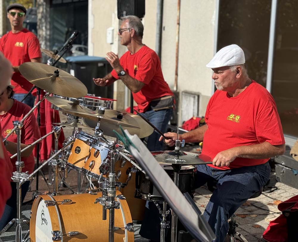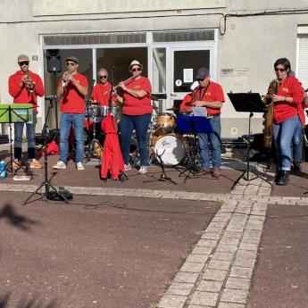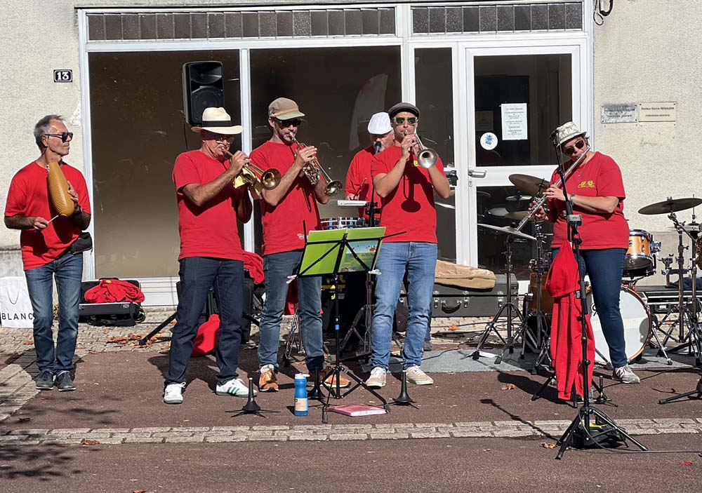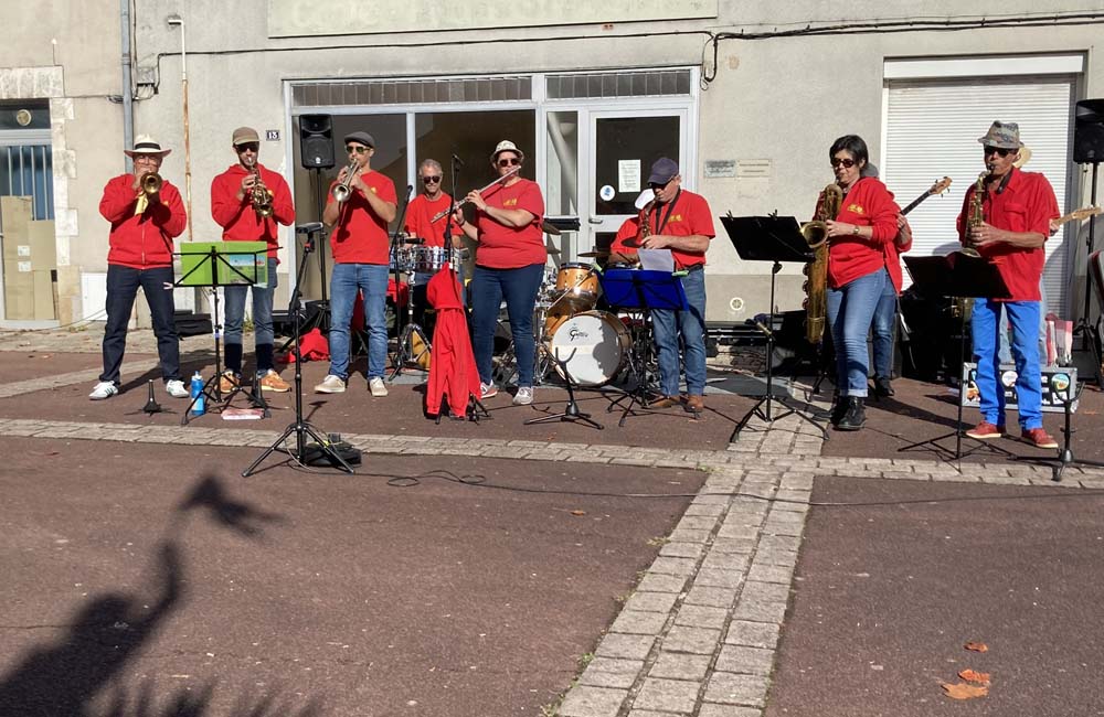 Soleil d'automne et accueil aux petits soins par les animateurs de la Fabric d'Orvault (Fabrique d’animations du BouRg et d’Initiatives Collectives) pour une prestation dominicale aux abords du marché, Place Jeanne d'Arc. Aux trompettes, Jacques, Étienne et Ludo, à la flûte traversière, Adeline, aux saxophones, Laurence, Jean-Michel et André, à la basse, Marc, à la guitare, Nicolas, et aux percussions, Raymond et Philippe.